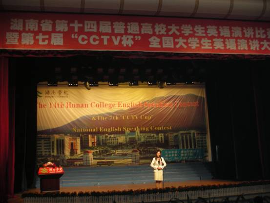 10月19日湖南省普通高等学校第十四届大学生英语演讲比赛暨第七届“CCTV杯” 全国大学生英语演讲大赛在湘南学院落下帷幕。由外国语学院院长陈勇教授、副院长熊云凤副教授、教务处毛小燕老师和芙蓉学院院长助理曾凡军率领的湖南文理学院两支代表队分别荣获本科一组“团体三等奖”、本科二组“团体二等奖”,李娇、孙轶君、胡奇冰同学获三项个人二等奖,杨文、邓俊杰同学获两项个人三等奖。