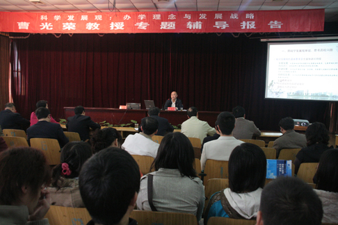 曹书记从科学发展观的第一要义是发展、科学发展观的核心是以人为本、科学发展观的基本要求是全面协调可持续、科学发展观的根本方法是统筹兼顾等四个方面具体阐述了科学发展观的内涵和实质。他说,只有从世界观和方法论的高度来认识和把握科学发展观,才能真正领会科学发展观的精神实质,只有用科学发展观来审视、思考高校建设发展方面的问题,才能不断增强学习实践科学发展观的自觉性和坚定性。
