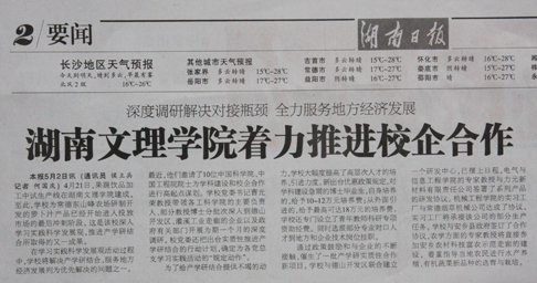 截止到目前,党委宣传部已在中央、省级、市级以上报纸、电视和网站等各类媒体发稿23篇,其中《“院士常德行”为地方发展支招》一文被4月10日的《光明日报》登载,《高校企业争请院士“把脉问诊”》和《湖南文理学院着力推进校企合作》(见图3)两篇消息则分别刊登在3月30日和5月3日的《湖南日报》上,这一组报道反映了我校党委、行政在学习实践活动中,突出实践特色,解决实际问题,通过深入调研深度推进校企产学研合作所取得的成效。