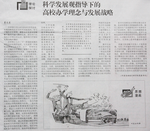 4月28日的《湖南日报》理论纵横版用较大篇幅刊载了党委书记曹光荣同志的理论文章《科学发展观指导下的高校办学理念与发展战略》(见图2)。