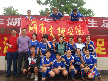 5月12日至16日,湖南省2009年大学生足球比赛在湘潭大学举行,来自全省24所高校的24支球队参赛。我校女子足球队第一次组队参赛,队员来自全校各学院,经过顽强拼搏,我校女子足球队获得女子组亚军,为学校赢得了荣誉。图为我校球员组织进攻。 (文/舒同 摄影/陈月华)