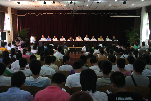 22日下午,我校在船型楼二楼报告厅成功举办了应届毕业生就业座谈会。常德市委书记卿渐伟、副市长万成贞,校党委书记曹光荣、副书记周国忠、副校长李敏、李达轩、张大顺、龚作奇、姚春梅,工会主席刘孟初,校长助理郭国强出席座谈会,市委组织部、市经委、教育局、人事局、劳动和社会保障局和商务局负责人及校学工部、招生就业处和生命科学学院、外国语学院负责人参加座谈会,并与300余名应届毕业学子就09年就业形势和政策进行了亲切座谈。
