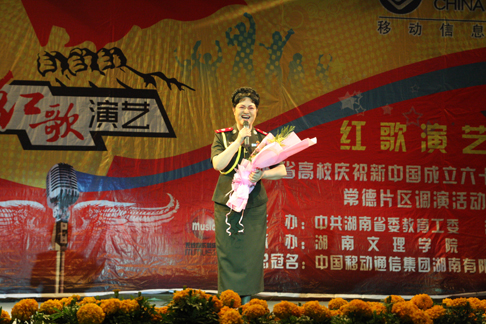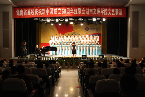 由中共湖南省委教委工委、湖南省教育厅主办,湖南文理学院、湖南教育电视台承办的湖南省高校庆祝新中国成立60周年红歌会湖南文理学院调演活动6月9日下午在我校音乐厅隆重举行,本次调演共演出了来自我校和常德职业技术学院13个节目。著名歌唱家、北京军区战友歌舞团国家一级演员耿莲凤老师作为特邀嘉宾满怀激情的为大家献上了《毛主席派人来》《北京的金山上》等红色歌曲,博得了大家的阵阵掌声。调演活动在《学习雷锋好榜样》的齐唱声中圆满落幕。 ( 文字/图片杨静)