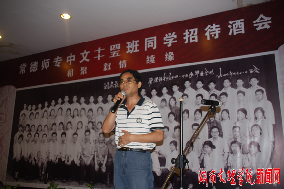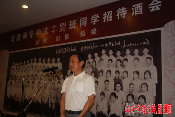 15日下午,招待酒会在芙蓉大酒店宴会厅举行,副校长李达轩、老教师代表廖忠致、覃光文、熊莘耕、刘子岸、吴雄甫、陈大年、廖作安、刘才林参加酒会。会上,校友曹儒国作为同学代表发言,优秀校友、国家新闻出版总署副署长蒋建国由于公务繁忙未到会,但他发来信函,字里行间表达了他对师友们的无限思念,寄托了他对老师和同学们的亲切问候与衷心祝福。李达轩副校长代表学校发表了热情洋溢的讲话,他说,我校自1958年建校以来,涌现出许多优秀的班集体,中文十四、十五班就是一个典型的代表,这两个班级里涌现出了蒋建国、曹儒国等一批值得母校骄傲和自豪的优秀校友,他们的成功之处在于其自身的良好素质,在于艰苦的岁月磨练了坚强的意志和和谐奋进的精神。他希望广大校友向这两个班集体学习,在各自的岗位上奉献热血、奉献青春、奉献才智,为母校增光添彩。