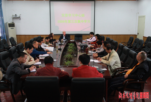 10月22日上午,校党委学习中心组在办公楼二会议室举行2009年第三次集中学习,党委书记曹光荣,校长魏饴,党委副书记石子球、周国忠,副校长李敏、李达轩、张大顺、龚作奇,工会主席刘孟初以及党政办、监察处、组织部、宣传部、学工部、团委、人事处、教务处、科技处、学科建设处等部门负责人参加学习和讨论。