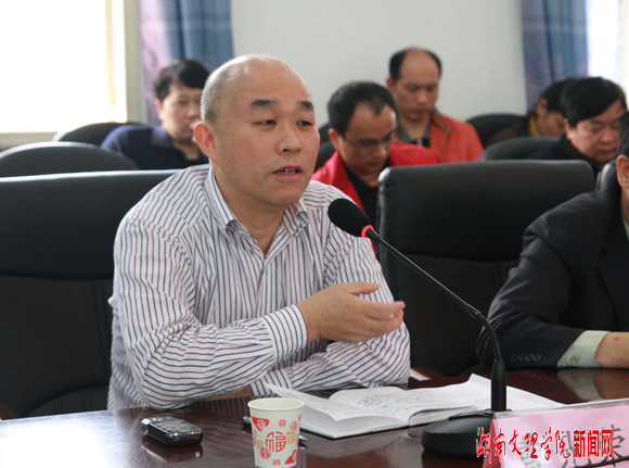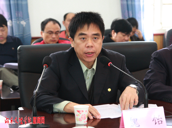 校长魏饴代表学校向申厅长一行汇报了我校自2008年下半年以来的学科建设与科技工作情况。魏校长指出,一年来,学校通过三大措施全面调整办学思路,加强学科建设:一是突出重点,加大投入。学校投入学科建设经费1100多万元,同比增加近30%。;二是针对弱点,全力以赴。邀请10位院士到校指导学科建设与国家课题申报;广泛发动和鼓励教学和科研人员申报各类课题近200项;采取培育和引进相结合的办法大力引进优秀人才;三是培育优势,打造特色。同时,魏饴校长还从学科队伍、科研项目、学科平台、科技奖励和科级成果等方面例举了我校所取得的科研成就。
