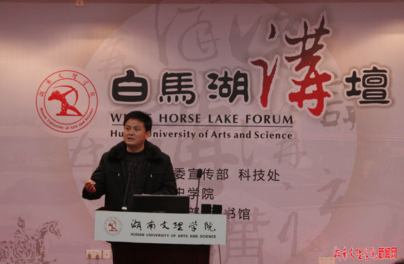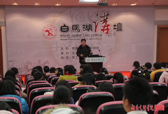 12月9日晚,由党委宣传部、科技处主办,文史学院承办,学工部、图书馆协办的大型系列人文讲座——“白马湖讲坛”第四讲在图书馆多功能厅开讲,主讲为文史学院副教授周星林,讲题为《常德丝弦为什么这样红》。本次讲坛由文史学院院长夏子科主持,近300名学生到现场聆听了讲座。