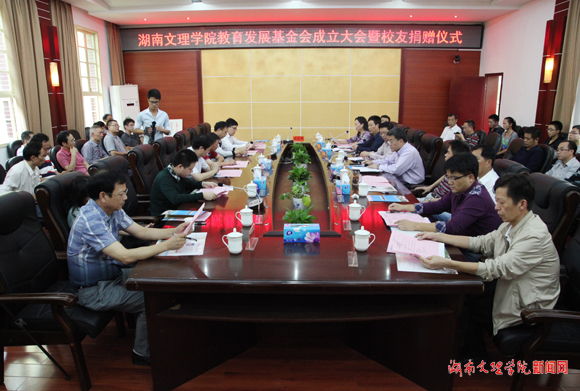 副校长龚作奇主持大会,他向与会人员介绍了参加本次活动的领导、嘉宾和有关同志,副校级督导、工会主席刘孟初宣读了省民政厅《关于同意设立湖南文理学院教育发展基金会的行政许可决定书》,校友联络办主任季红星宣读了湖南文理学院教育发展基金会第一届理事长、副理事长、秘书长、理事、监事组成人员名单。其中,校内理事成员有:李民、龚作奇、李钢、季红星、周长安、庹进平;校外理事成员有:常德市发改委主任汤祚国、湖南联储沥青科技有限公司董事长吴远明、湖南云锦集团有限公司董事长陈亮、湖南新泓信实业集团董事长赵泉清、汉寿正阳化工有限公司董事长曾勇、湖南恒至凿岩科技有限公司董事长文会军;刘孟初担任监事。