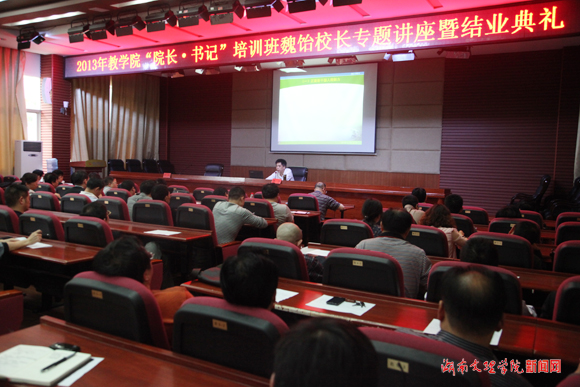 本网讯(记者 缘柏 摄影 杨静)5月9日下午,中共湖南文理学院委员会党校教学院院长·书记培训班第三场专题讲座暨结业典礼在船形楼多功能厅举行。校长魏饴以《漫谈干部修养》为题为学员们作了一场精彩的报告。校党委书记李民主持报告会,党委副书记李敏在结业典礼上讲话。各教学院院长、党总支书记、机关职能处室负责人聆听了报告。
