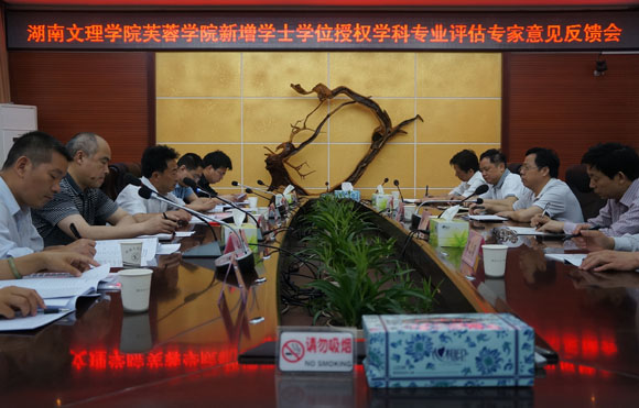 本网讯(记者 郝雨 摄影 召月)5月17日上午11点,芙蓉学院专业办学水平评估和新增学士学位授权学科专业评估反馈会在办公楼二会议室举行。专家组成员中南林业科技大学副校长曹福祥教授、省教育厅高教处副处长杨承玖、中南大学本科生院综合办副主任赵军教授、湖南商学院教务处处长易松芝教授、湖南理工学院教务处处长徐小立教授,专家组联络员、省教育厅干部李漓和我校副校长龚作奇、唐圣松,正校级督导石子球出席反馈会,芙蓉学院领导班子成员和相关教师参加了会议。
