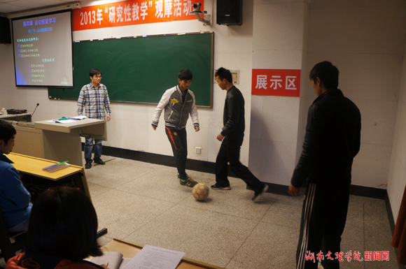 在这两天的观摩活动中,来自体育学院、外国语学院、电信学院、文史学院和化工学院的五位教师用“研究性教学”的教学方法为大家讲授了五节专业课。28日上午,李民、唐圣松、刘孟初、齐恒观摩了体育学院教师杨锋主讲的《体育心理学》——“运动技能的迁移”。杨锋按照“研究性教学”理念,从“课前导学”课题入手,组织学生分成六个小组对“运动技能的迁移”这一问题进行分析和讨论,然后学生走上讲台将小组讨论结果向全班进行现场展示和讲解,最后由教师进行小结并布置课后作业。课堂上,教师和学生互动频繁,学生参与课程的积极性很高,颠覆了满堂灌的教学方式,充分展现了“研究性教学”的风采和魅力。