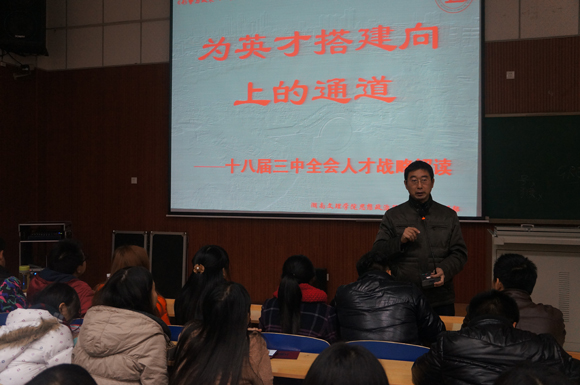 本网讯(记者 沽月)2013年12月18日晚7点, T3-D101座无虚席,来自全校各学院的500余名学生党员正在这里认真聆听十八届三中全会精神宣讲报告。这是由学校宣传部、学工部、团委、思想政治课教学科研部、关工委五部门联合主办的十八届三中全会精神宣讲活动系列讲座的第三场:思想政治课教学科研部副主任黄向阳教授主讲的《为英才搭建向上的阶梯——十八届三中全会人才政策解读》。