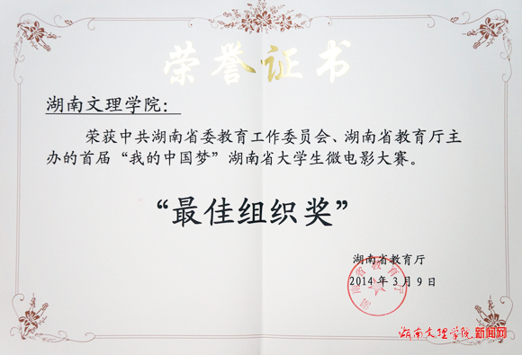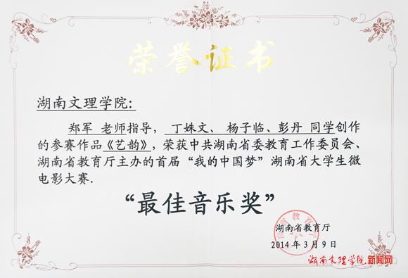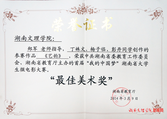 (记者 文峰 摄影杨静)3月9日,由中共湖南省委教育工委、湖南省教育厅主办的首届“我的中国梦”湖南省大学生微电影比赛结果揭晓,我校党委宣传部郑军老师指导,芙蓉学院丁姝文、彭丹,文史学院杨子临同学创作的微电影《艺韵》获“最佳美术奖”、“最佳音乐奖”,学校获“最佳组织奖”。(责编 袁尹)