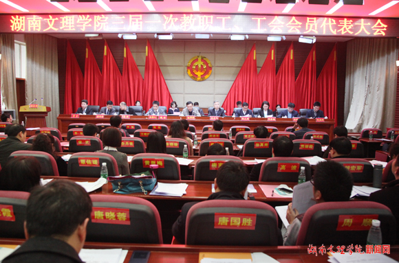 本网讯(记者 胡眣 摄影 杨静)3月17日,我校三届一次教职工、工会会员代表大会在船形楼多功能报告厅胜利召开。魏饴、谷正气、李敏、张大顺、龚作奇、姚春梅、郭国强、曾言、刘孟初等10余名主席团成员在主席台就座,10个代表团的140余名正式代表、50余名列席代表、12名特邀代表参加了会议。省教育工会副主席杨舜桃到会祝贺。