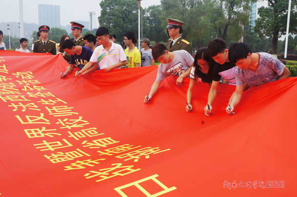 本网讯(记者 袁勇军 摄影 杨静)6月19日下午,“勿忘国耻,圆梦中华——纪念抗日战争暨世界反法西斯战争胜利70周年湖南省高校百万师生签名活动”在我校水景广场隆重举行。活动由湖南省委教育工委、湖南省全民国防教育委员会办公室主办,湖南教育电视台承办。纪委书记曾言,宣传部、团委、学工部、保卫处主要负责人与近500名师生代表参加了签名活动。