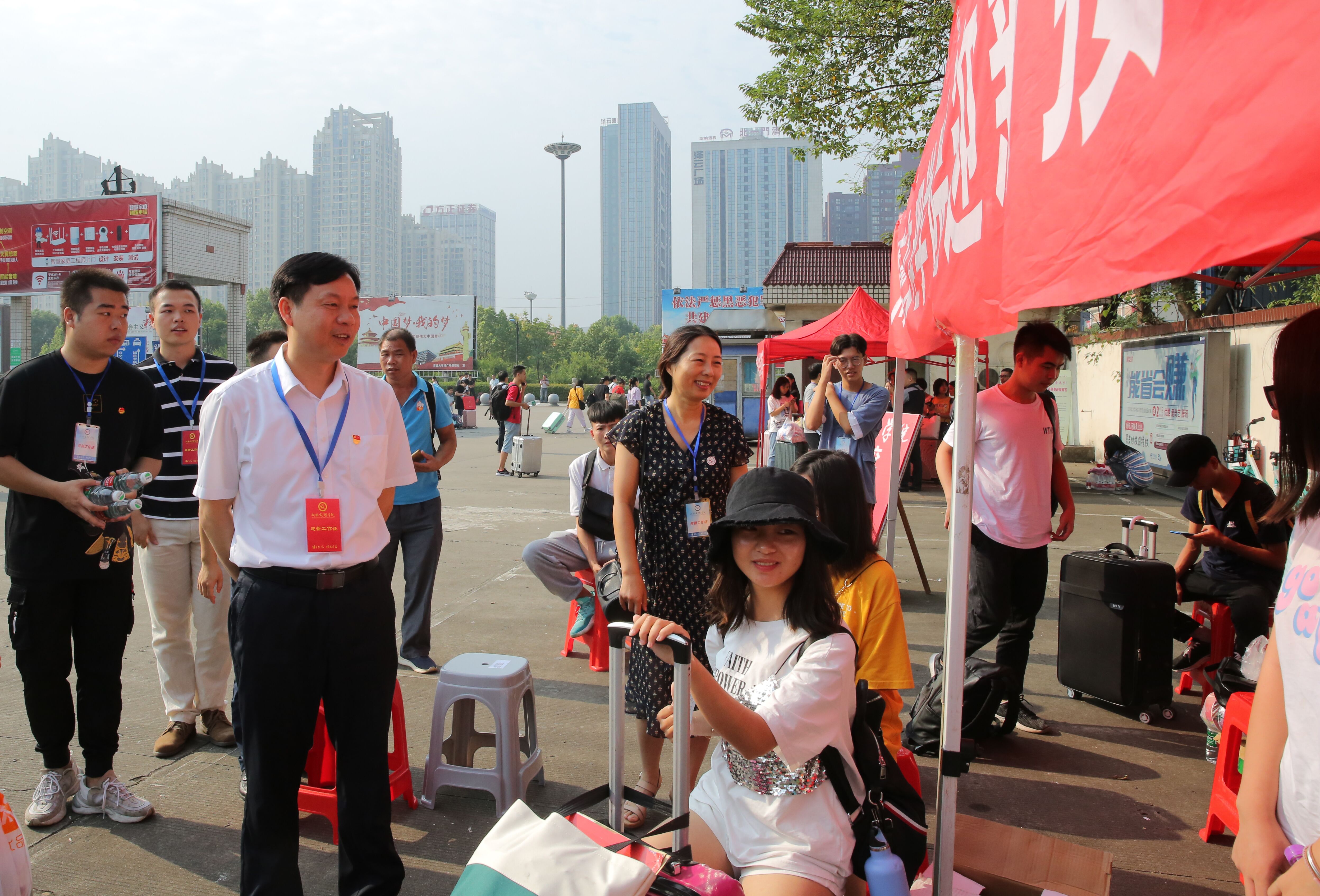 龙献忠一行在火车站迎新现场看望慰问了前来报到的2019级新生、家长以及工作人员,并引导学生及家长乘坐大巴前往学校报到。随后,龙献忠一行还前往芙蓉学院迎新点,他逐一巡视了各个学院的迎新现场,并与师生进行了交流,向工作人员询问了迎新工作各方面的情况。