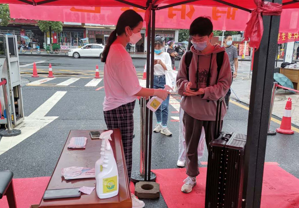 工作人员在校门口为返校学生行李消毒
