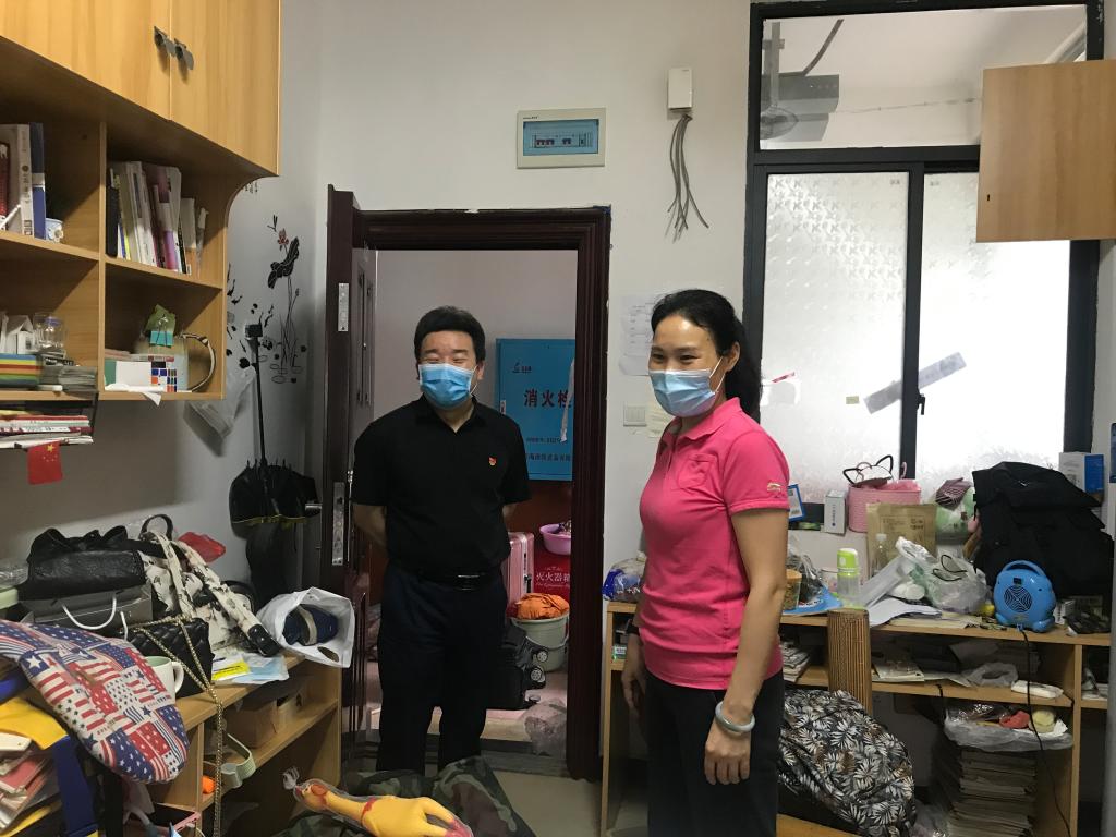 党委委员、纪委书记曾言(左1)在寝室看望返校学生