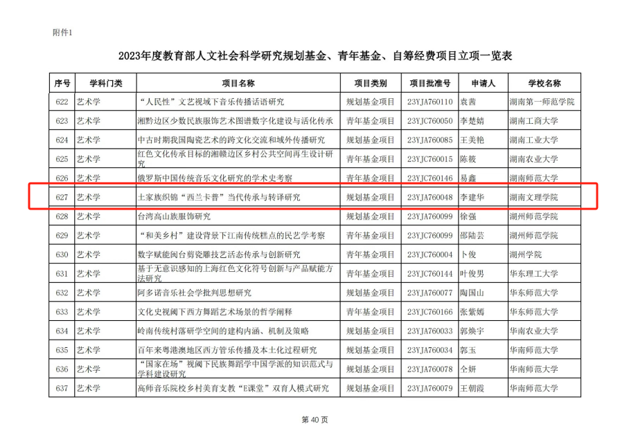 本网讯(通讯员 王辉)近日,教育部社科司公布了2023年度人文社会科学研究项目立项名单,我校美术与设计学院李建华教授申报的《土家族织锦“西兰卡普”当代传承与转译研究》获得本年度全校唯一一项规划基金项目立项。
