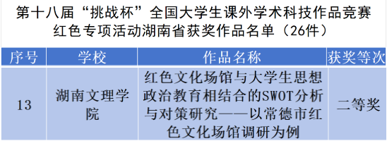 我校马克思主义学院《红色文化场馆与大学生思想政治教育相结合的SWOT分析与对策研究--以常德市三类红色文化场馆的调研为例》荣获第十八届“挑战杯”全国大学生课外学术科技作品竞赛红色专项活动二等奖,这是学校在全国“挑战杯”竟赛中取得的历史最好成绩。