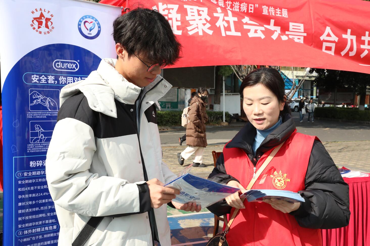本网讯(国际学院 供稿 记者 余文靖 周湘涵 摄影 王玉瑶)2023年12月1日是第36个“世界艾滋病日”。为进一步强化在校大学生对艾滋病防治政策和知识的认识,12月1日上午,“凝聚社会力量,合力共抗艾滋”艾滋病防治宣传活动在我校西校区北院篮球场举行。本次活动由武陵区疾病预防控制局、武陵区疾病预防控制中心主办,湖南文理学院、常德市第一人民医院、常德市妇幼保健院协办。