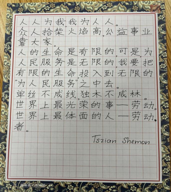 留学生和志愿者们一起摘抄雷锋的经典语录,仔细体悟雷锋精神,留学生们在静心练习书写汉字的同时深入理解和感悟雷锋同志的言行,给人以激励和启迪。大家在教室里一起探讨60多年前诞生的“雷锋精神”对于当下社会的现实意义。留学生们表示,雷锋精神不受年代、环境、国籍、地点的制约,是值得当代青年传承和发扬的精神。中国青年志愿者们则表示,每个人都要争做讲好“雷锋精神”等中国故事、传播好中国声音的新时代青年,努力成长为堪当民族复兴重任的时代新人。