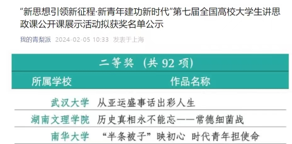 本网讯(通讯员 俞芬)近日,“新思想引领新征程·新青年建功新时代”第七届全国高校大学生讲思政课公开课展示活动圆满落幕, 我校报送的作品《历史真相永不能忘——常德细菌战》斩获全国二等奖。