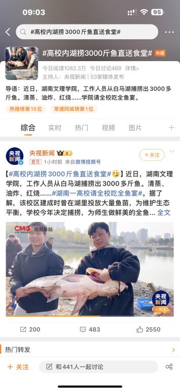本网讯(记者 袁勇军)12月27日上午,湖南文理学院在校内白马湖捞起5000斤大鱼供师生免费尝鲜的幸福事儿,被全国人民都知晓了!央视新闻直接置顶新闻《湖南一高校请全校吃全鱼宴》,引发了全国人民的关注和热议,新浪微博话题“高校内湖捞3000斤鱼直送食堂”直接冲上了微博热搜第十名,在一个小时内,相关视频和话题被1000多万网友观看、转发、评论。