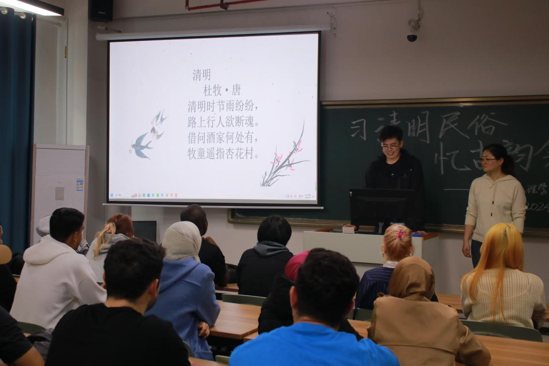 本网讯(通讯员 朱新宇 黄说思)“清明时节雨纷纷,路上行人欲断魂……”4月2日下午,我校国际学院的教室里传来一阵阵不太流畅的吟诗声,原来是来自俄罗斯、老挝、哈萨克斯坦、摩洛哥等11个国家的26名留学生在朗诵中国古诗《清明》,他们在朗朗书声里体验传承千年文化的古韵之美,了解清明节的意义。