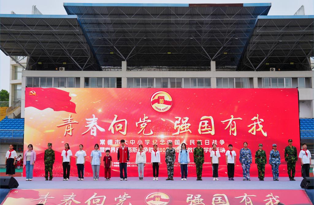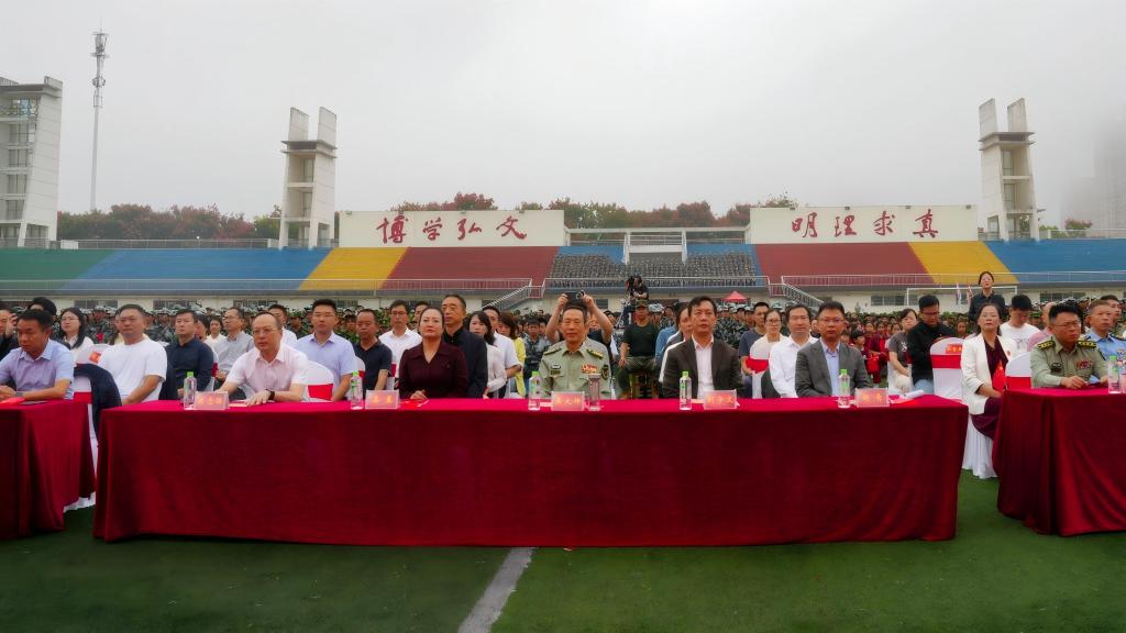 本网讯(文字 袁勇军 图片 王祺)9月28日上午,“青春向党 强国有我”——常德市大中小学纪念中国人民抗日战争暨世界反法西斯战争胜利80周年国防教育进学校主场活动,在湖南文理学院第一田径场举行。市委常委、常德军分区政委黄大坤,我校党委书记刘宇文,党委委员、副校长晏昱等出席活动。