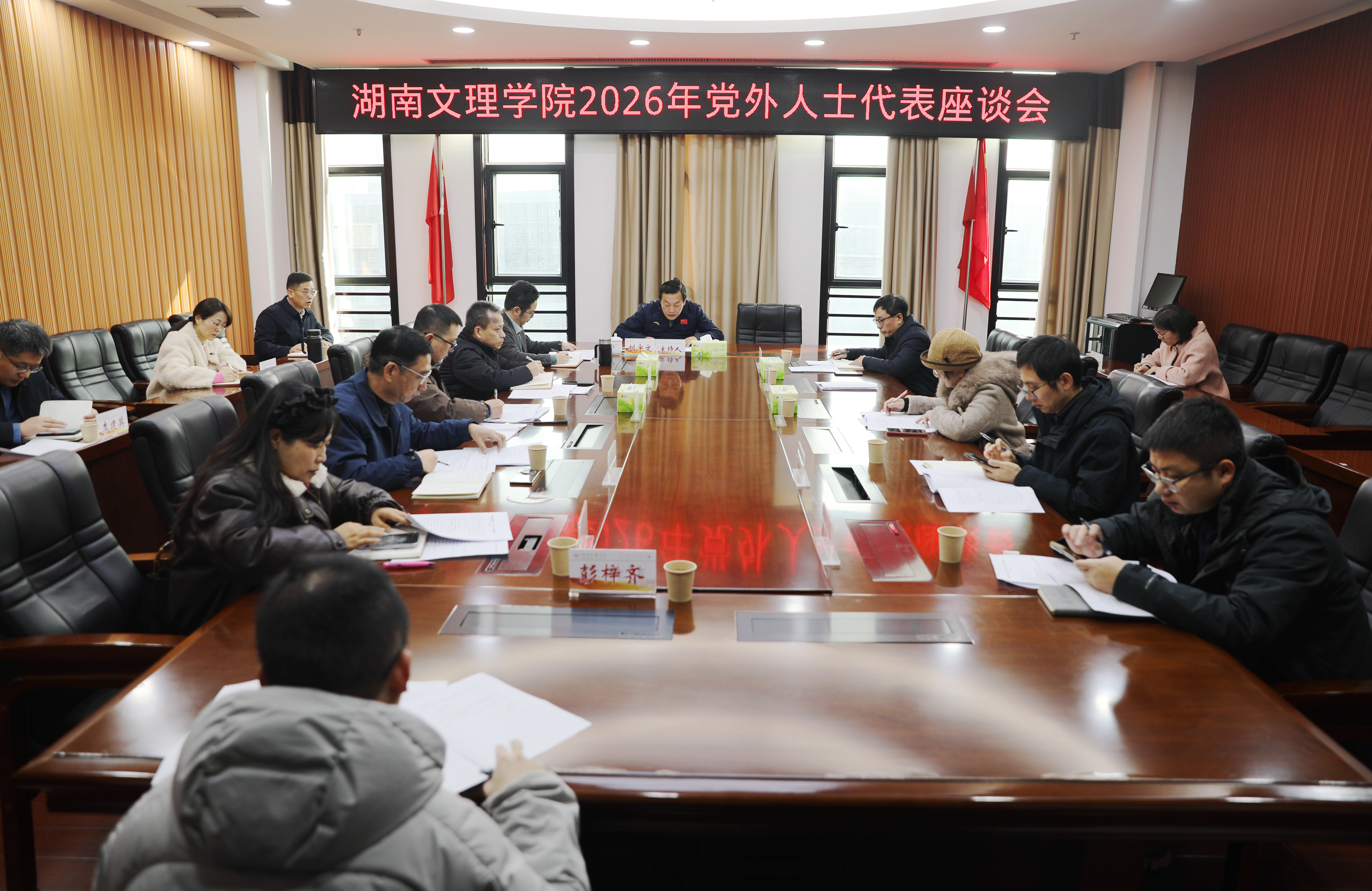 本网讯(文字 赵柳 图片 易姣)1月6日上午,学校2026年党外人士代表座谈会在逸夫楼A704会议室召开。党委书记刘宇文主持会议,在校市政协委员、市民主党派副主委,各民主党派、统战团体主要负责人、无党派青年教师代表参加会议。大家欢聚一堂,通报情况、听取建议、畅叙友情、共话发展。