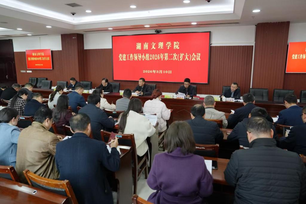 本网讯(文字 袁勇军 图片 易姣)3月10日,学校党建工作领导小组2026年第二次(扩大)会议在逸夫楼B603召开,传达学习习近平总书记重要讲话重要指示精神,学习中央和省委党的建设工作领导小组会议精神,对《湖南文理学院关于开展树立和践行正确政绩观学习教育的工作方案》进行了解读。全体在家党委委员出席会议,副校长肖小勇以及二级党组织书记、机关教辅部门主要负责人列席会议。学校党委书记刘宇文主持会议并讲话。