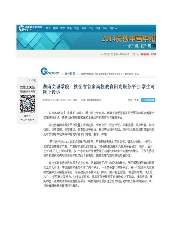 湖南教育网:湖南文理学院推全省首家高校教育阳光服务平台