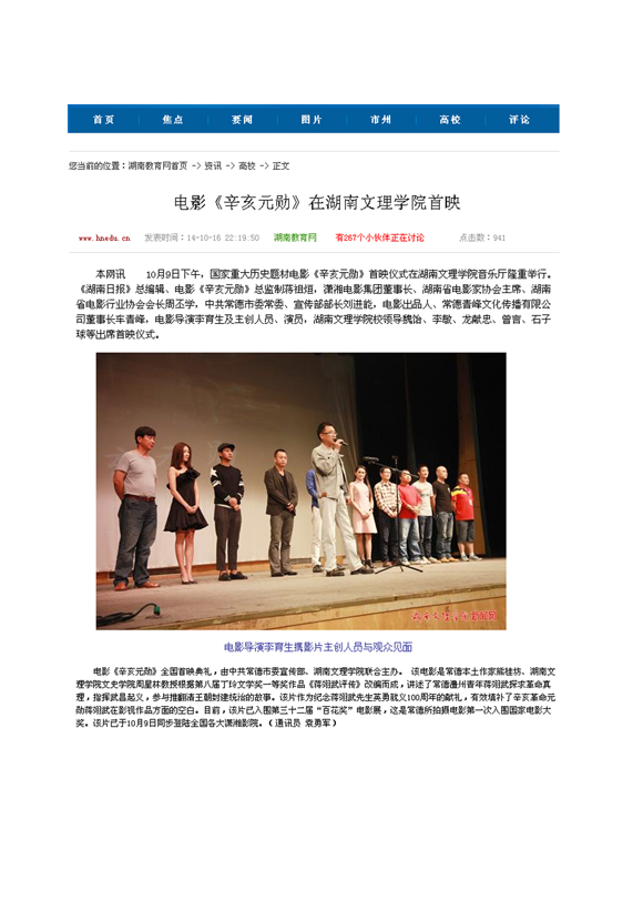 湖南教育网:电影《辛亥元勋》在湖南文理学院首映