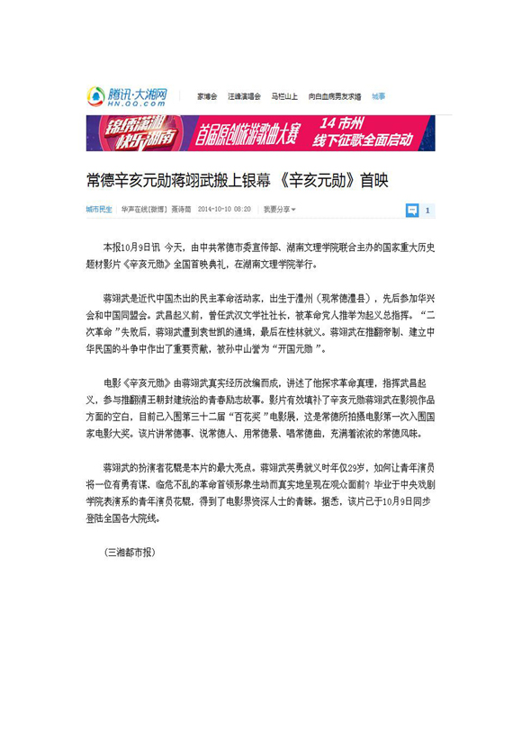 腾讯网:常德辛亥元勋蒋翊武搬上银幕