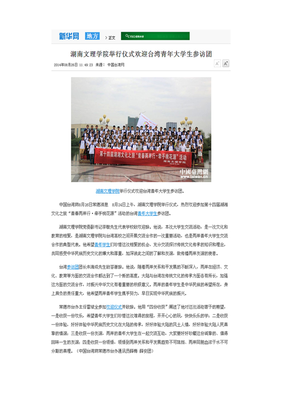 新华网:湖南文理学院举行仪式欢迎台湾青年大学生参访团