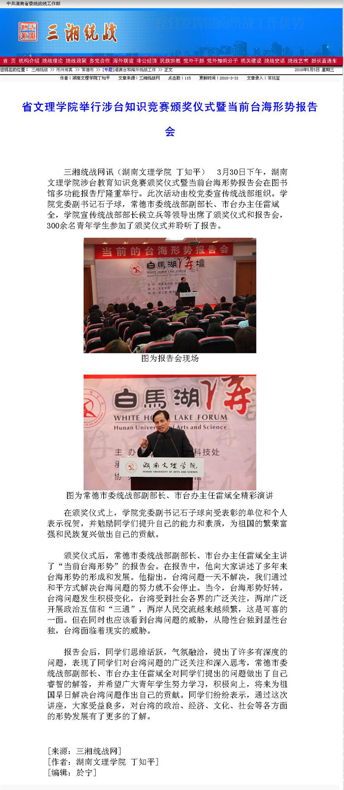 三湘统战网《文理学院举行涉台知识竞赛颁奖仪式暨当前台海形势报告会》