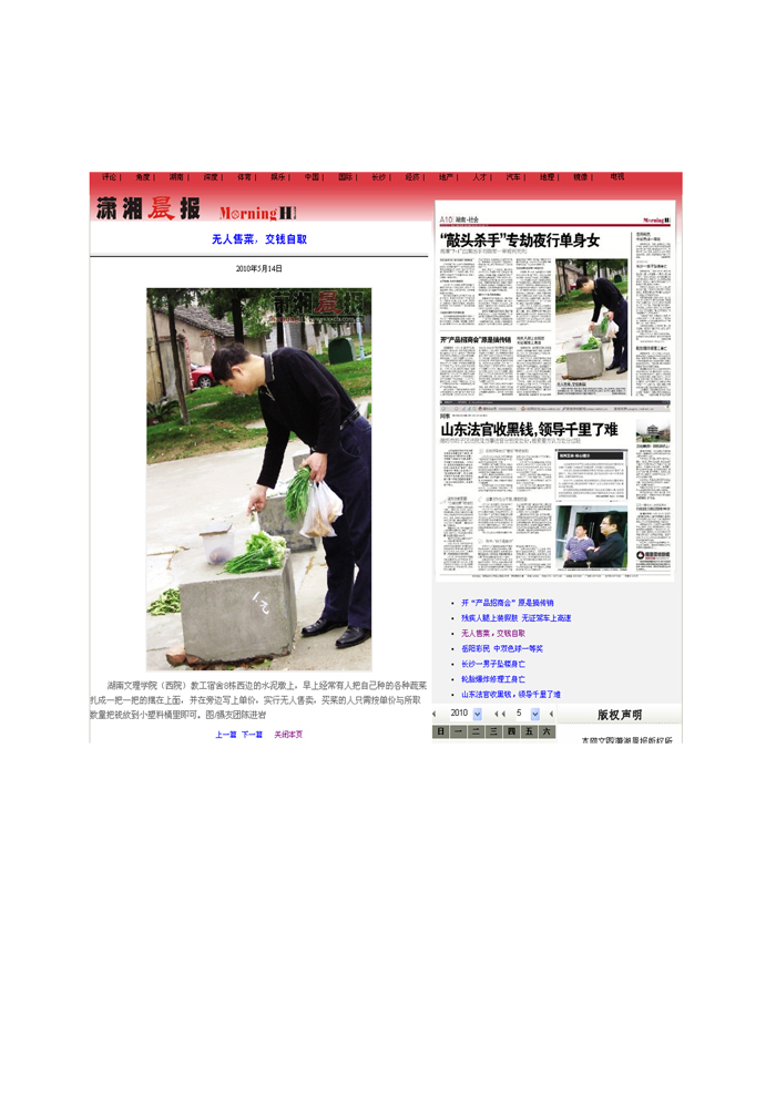 《潇湘晨报》无人售菜 交钱自取