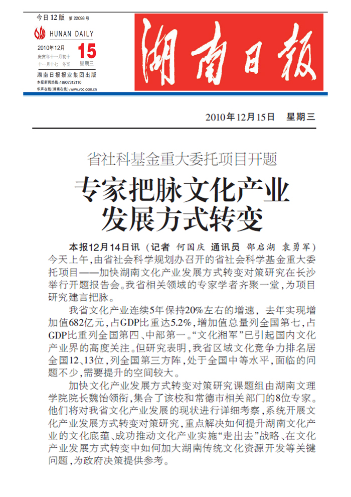《湖南日报》专家把脉文化产业发展方式转变
