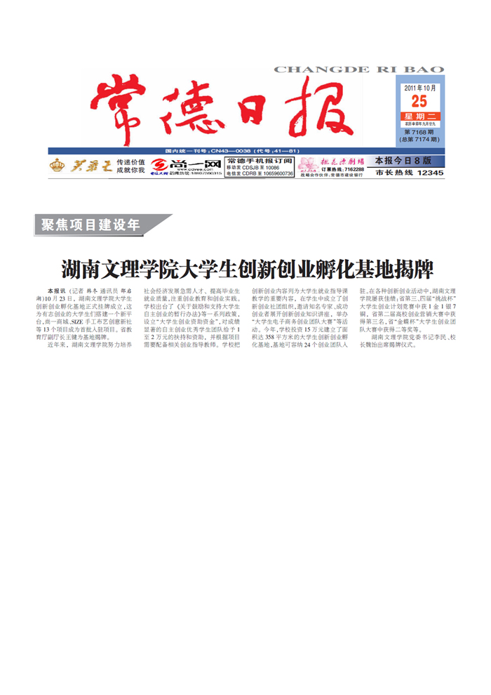 《常德日报》湖南文理学院大学生创新创业孵化基地揭牌