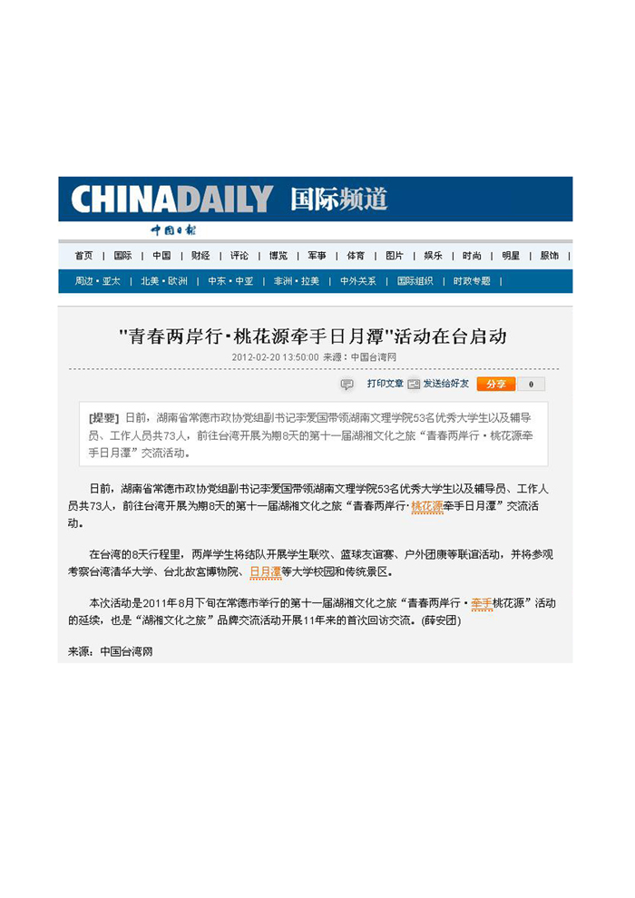 《中国日报》:“青春两岸行.桃花源牵手日月潭”活动在台启动