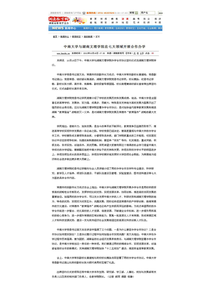 湖南教育网:中南大学与湖南文理学院在七大领域开展合作办学