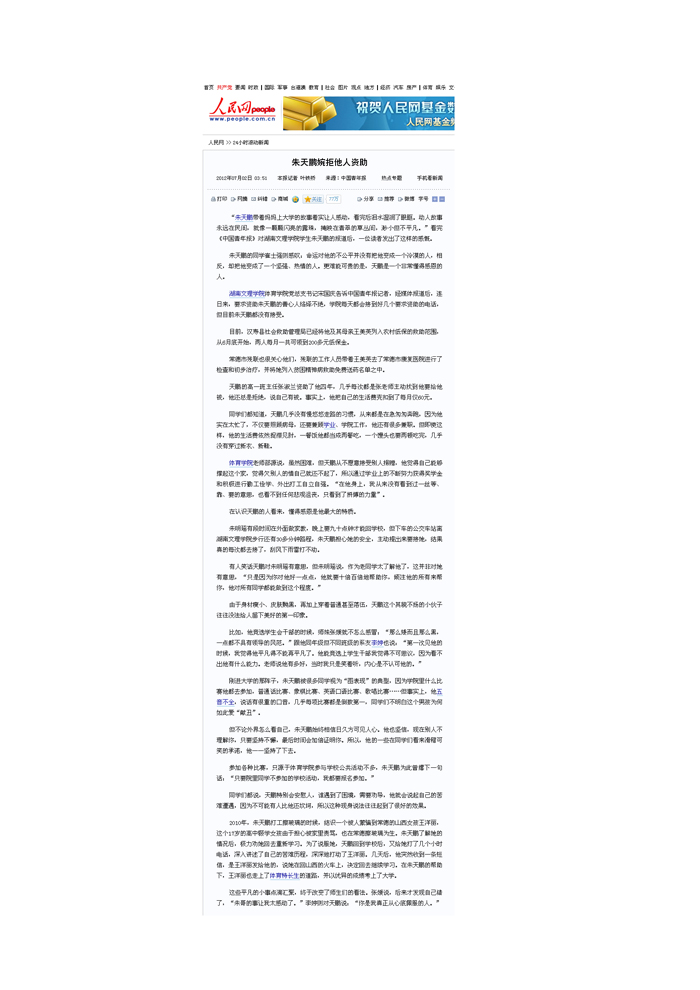 人民网:朱天鹏婉拒他人资助