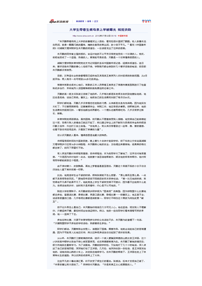 新浪教育:大学生带着生病母亲上学被曝光 婉拒资助