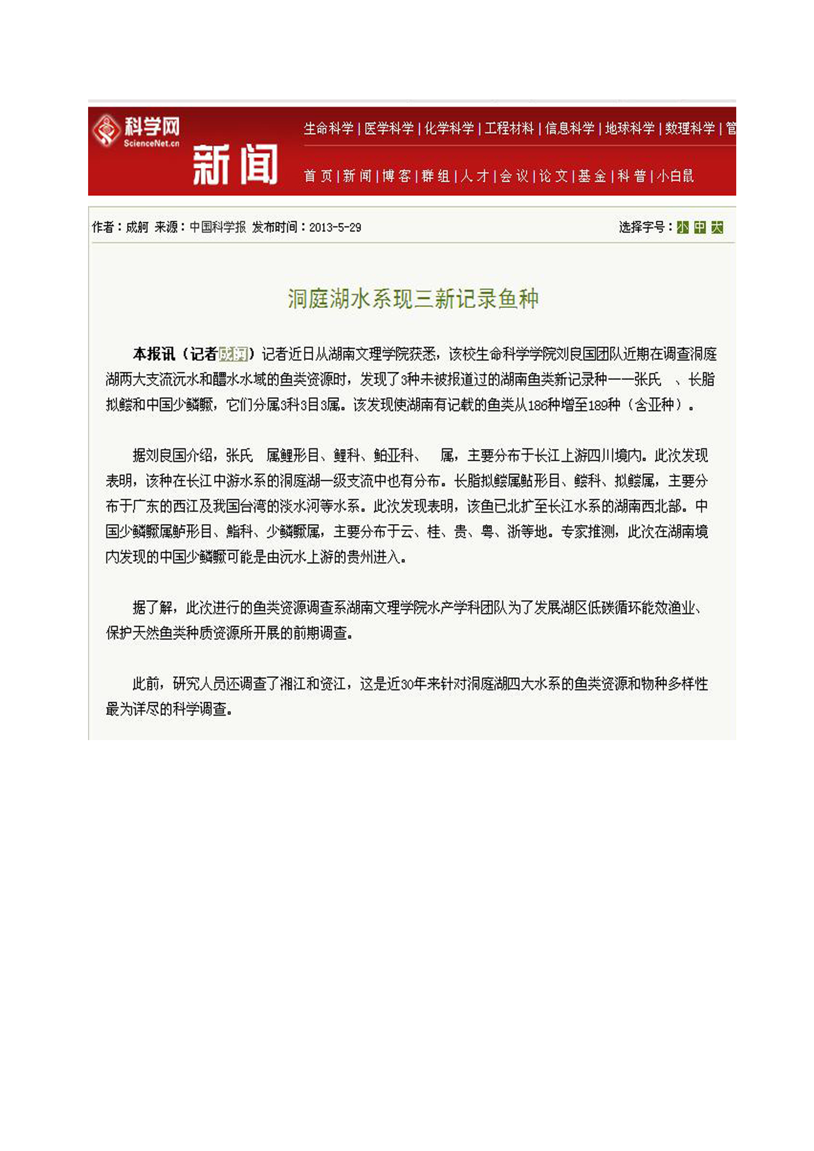 中国科学报:洞庭湖水系现三新纪录鱼种