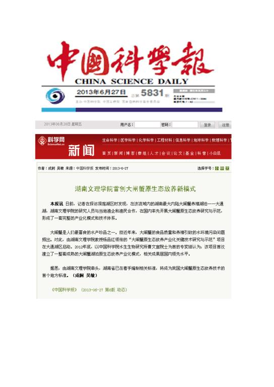 中国科学报:湖南文理学院首创大闸蟹原生态放养新模式