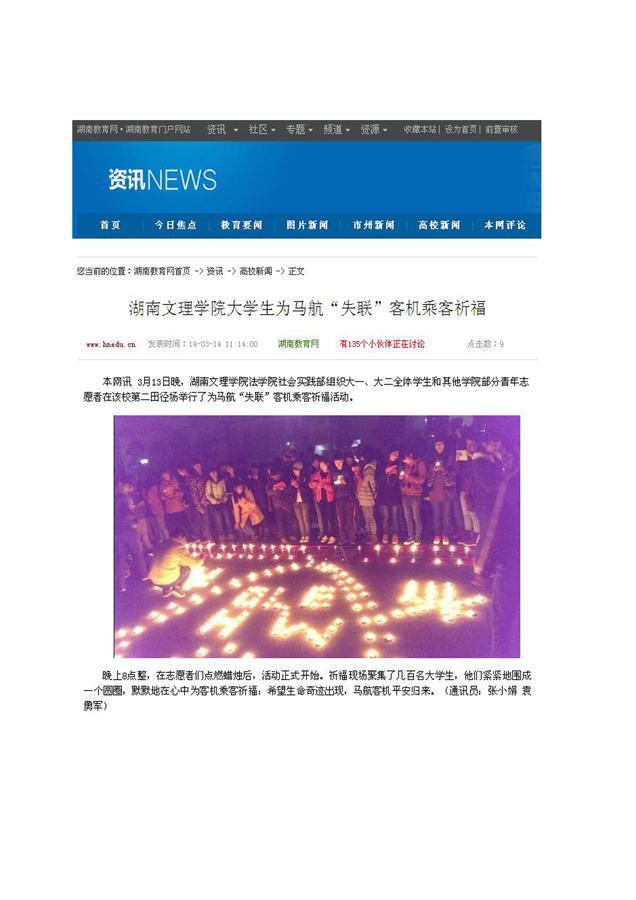 湖南文理学院大学生为马航“失联”客机乘客祈福