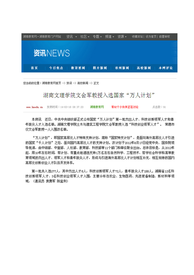 湖南文理学院文会军教授入选国家“万人计划”