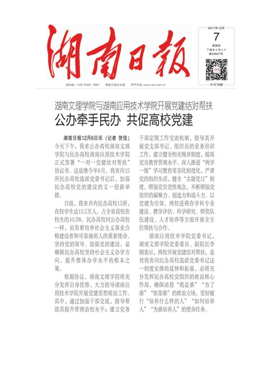 湖南日报:公办牵手民办 共促高校党建 湖南文理学院与湖南应用技术学院开展党建结对帮扶