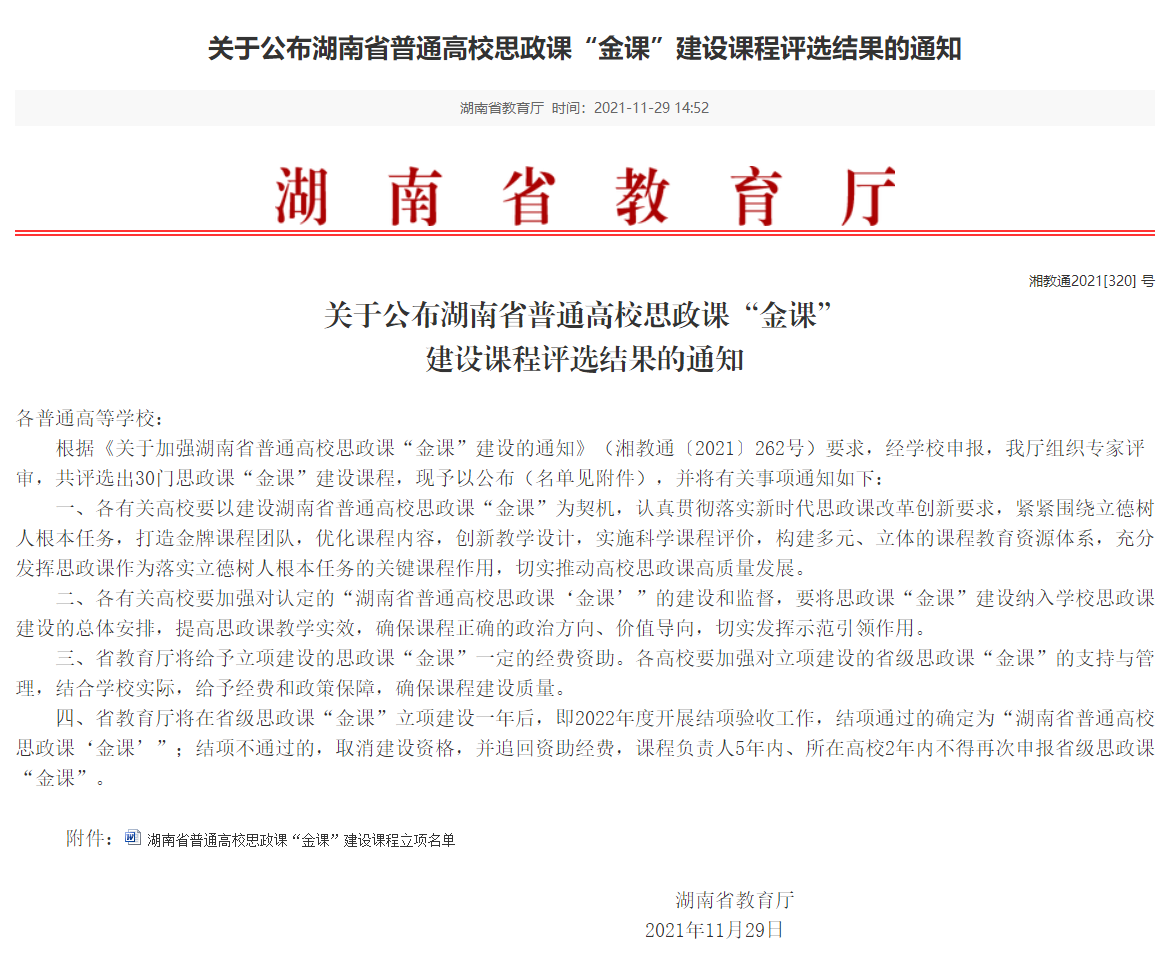 为认真贯彻落实新时代思政课改革创新要求,紧紧围绕立德树人根本任务,打造金牌课程团队,省委教育工委、省教育厅决定在全省遴选一批思政“金课”建设课程,经过各高校申报和严格评审,全省共24所高校的30门思政课程获准立项为思政“金课”建设课程。